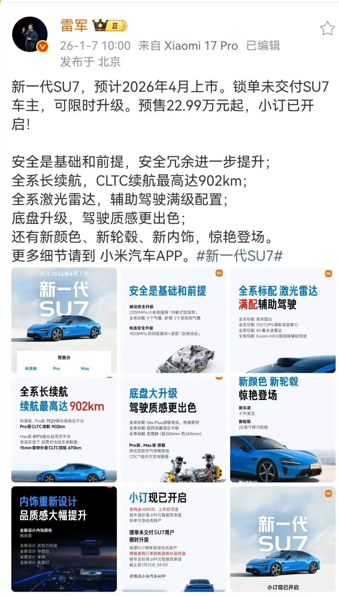 1月7日,小米汽车正式揭开了新一代SU7的预售帷幕。标准版、Pro版、Max版三款配置,预售价格分别为22.99万元、25.99万元和30.99万元。相比现款,入门价格上调1.4万元。