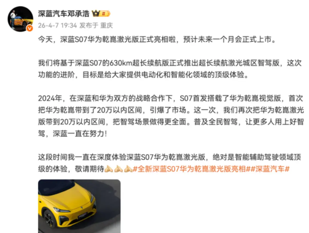 4月7日,深蓝S07华为乾崑激光版正式官宣,预计一个月内上市,价格锁定在20万元以内。这是菊厂高阶智驾系统首次把激光雷达版本下探到20万级市场,距离2024年深蓝把菊厂乾崑视觉版带进20万以内,才过了两年。